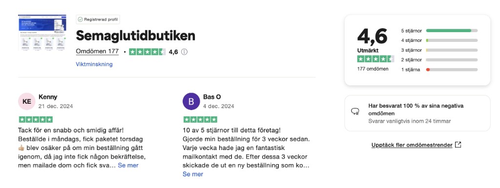 Under två års tid har Semaglutidbutiken funnits på Trustpilot där vi var rankade som 3:e bästa viktminskning företaget i Sverige med toppbetyg.